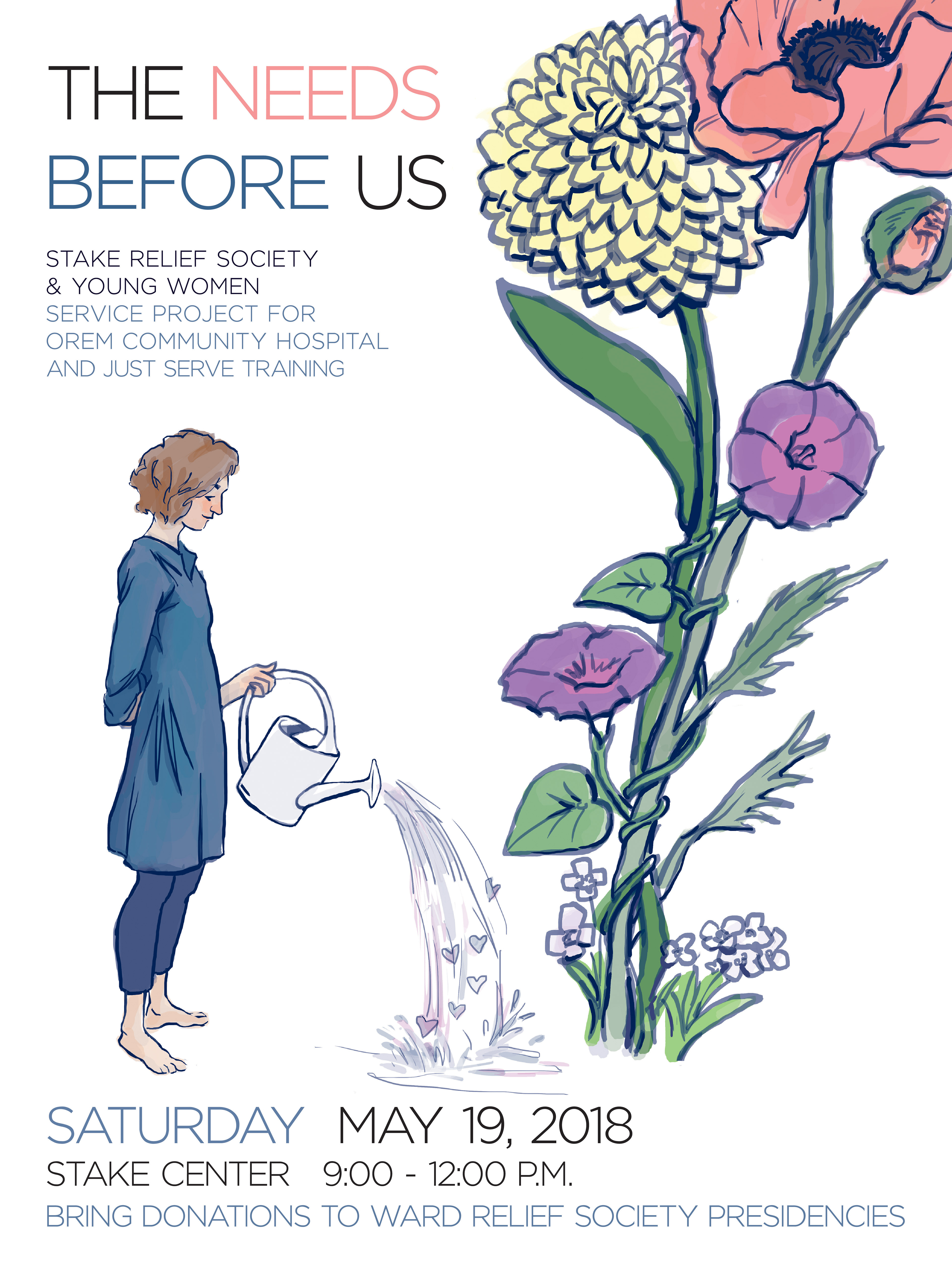 Illustration & design for local Relief Society church community service event poster and quarter-page flyer.