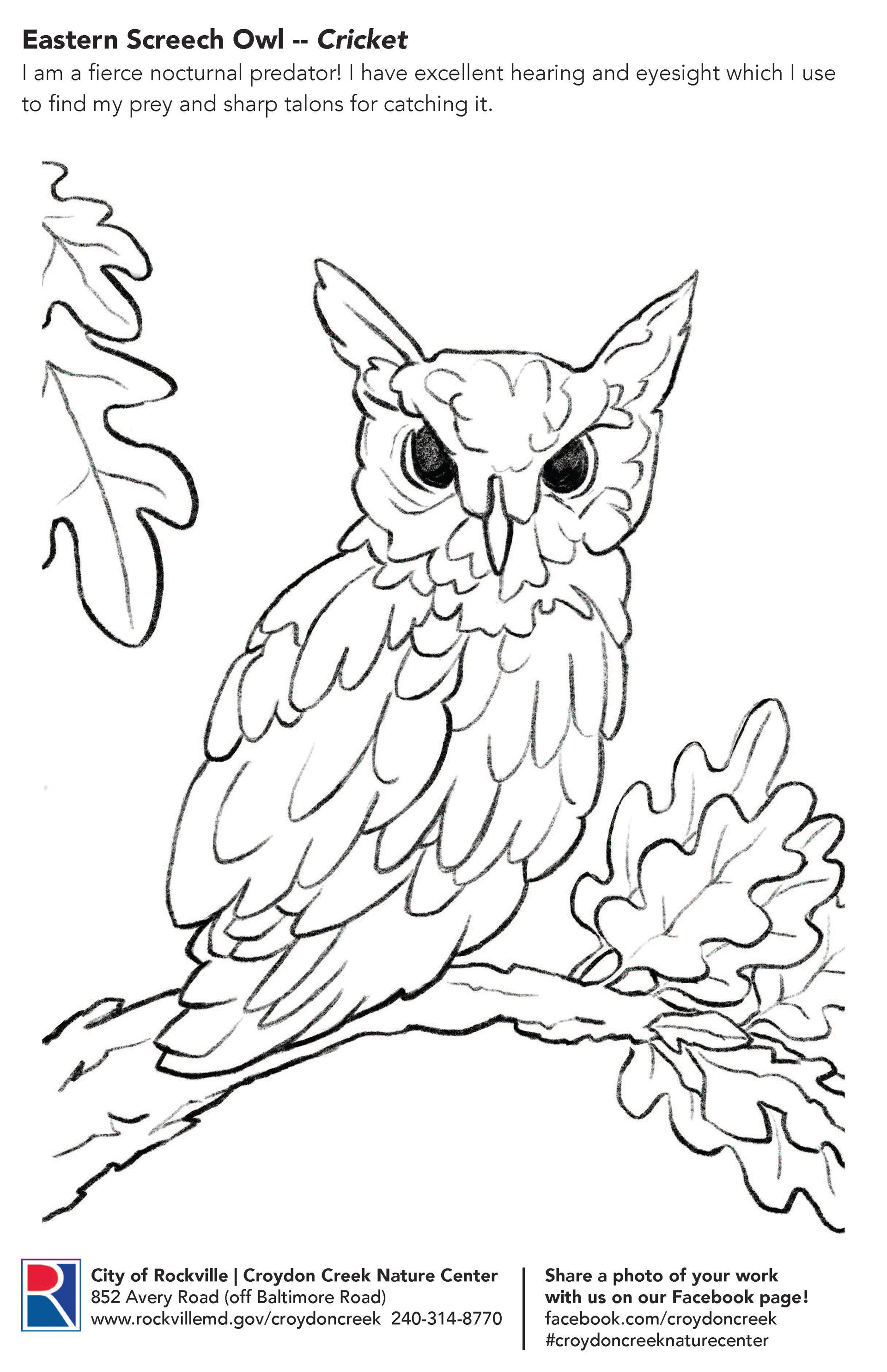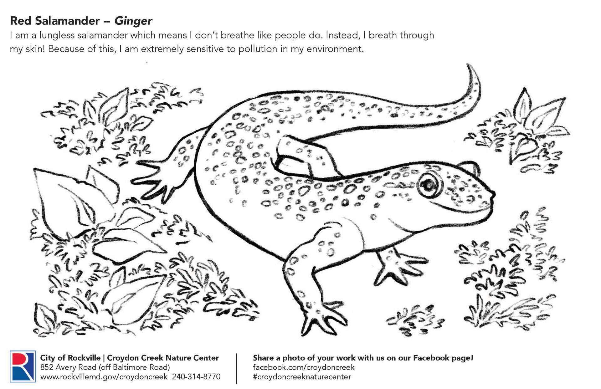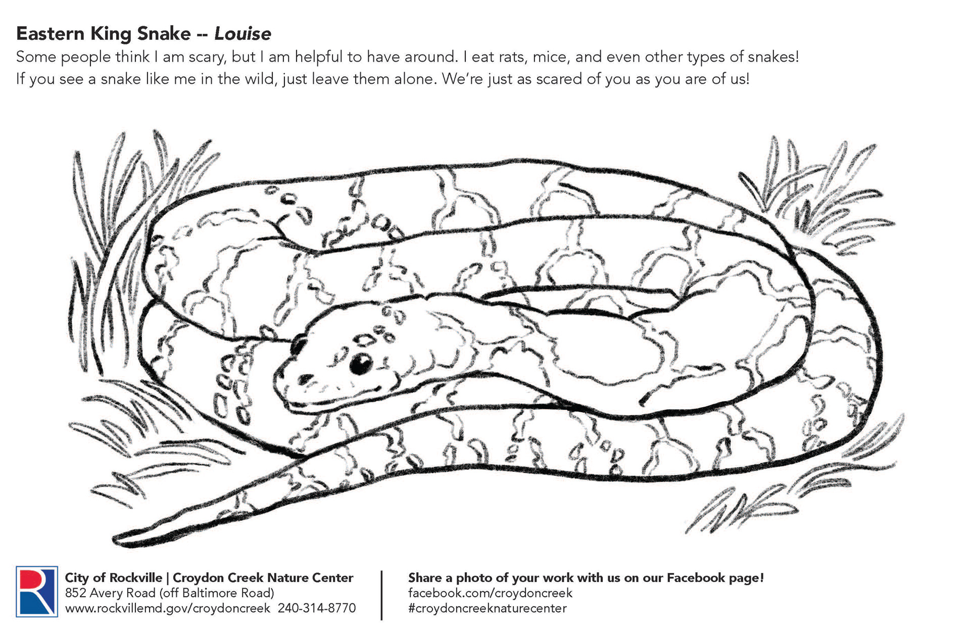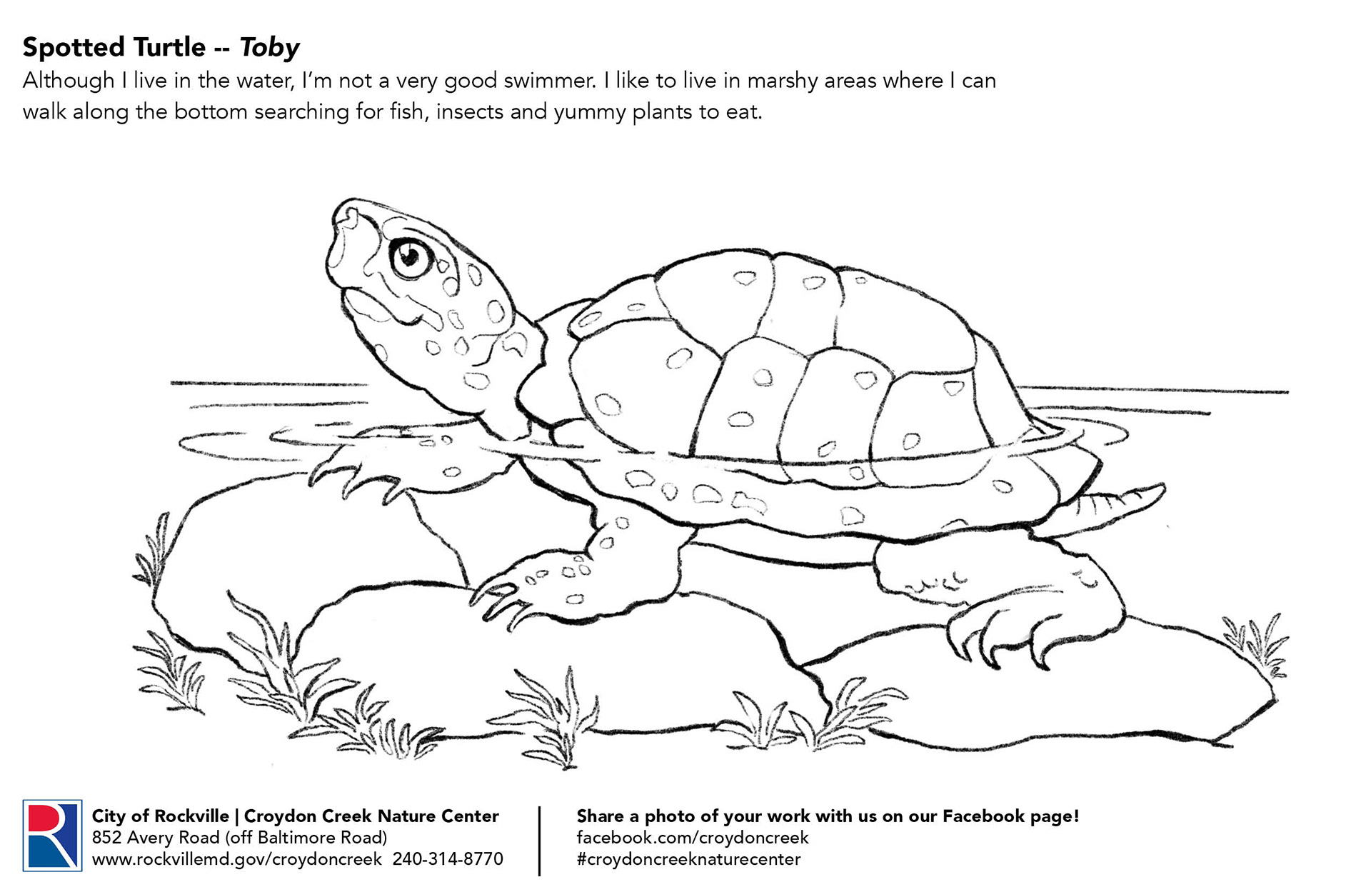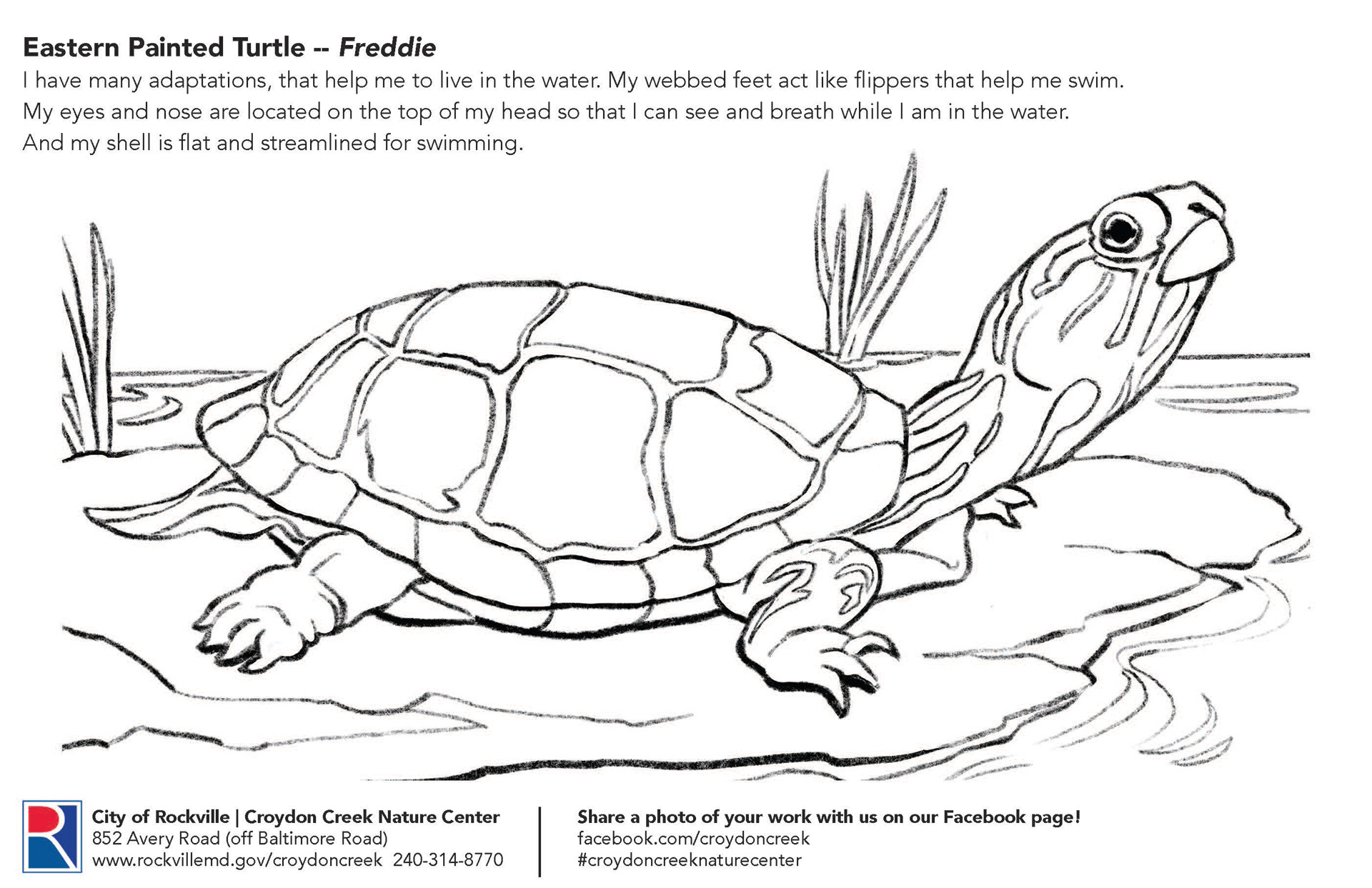 Coloring pages highlighting animal residents for visitors to Croydon Creek Nature Center in Rockville, MD.